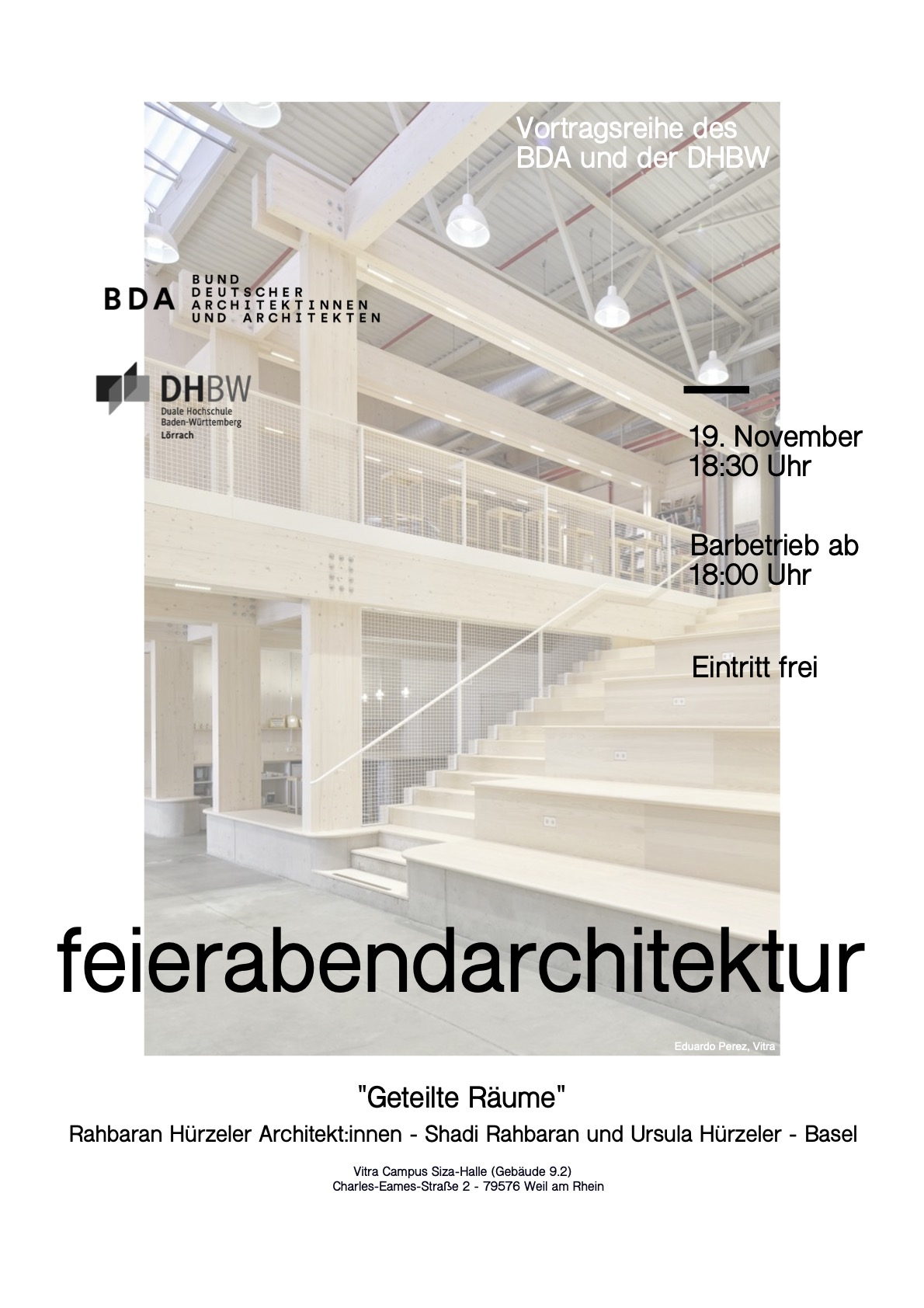 Der Bund Deutscher Architekten und die DHBW Lörrach laden zur Vortragsreihe „feierabendarchitektur" ein. Am 19. November erwartet Sie ein Vortrag von Shadi Rahbaran und Ursula Hürzeler von Rhabaran Hürzeler Architekt:innen SIA BSA, Basel zum Thema „Geteilte Räume".