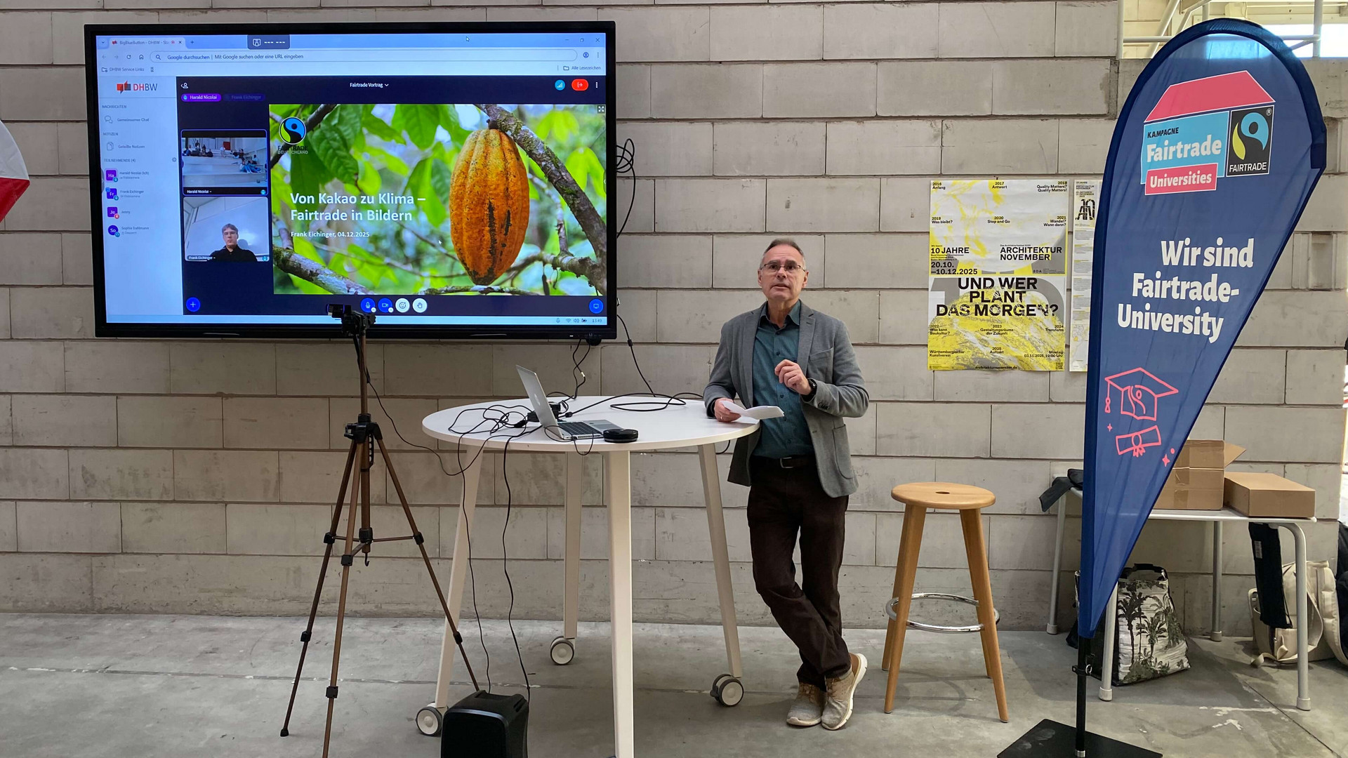 Studierende der DHBW Lörrach konnten beim Online-Vortrag von Dr. Frank Eichinger spannende Einblicke in den Fairtrade-Kakaoanbau erhalten und bei der Verkostung faire Produkte ausprobieren – als Teil des Engagements der DHBW Lörrach als Fairtrade University.