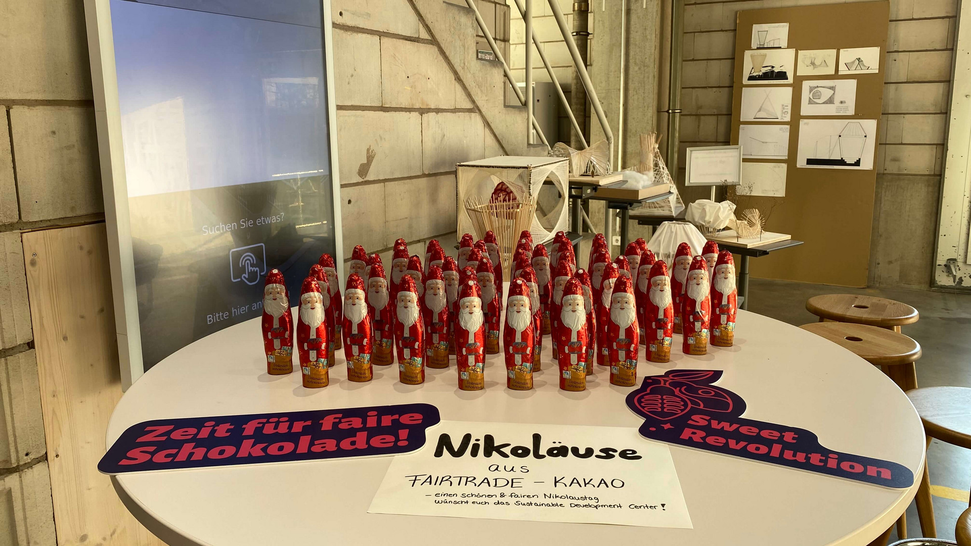 In der Pause konnten die Studierenden faire Produkte probieren. Passend zur Weihnachtszeit erhielten sie außerdem einen kleinen Nikolaus aus Fairtrade-Kakao.