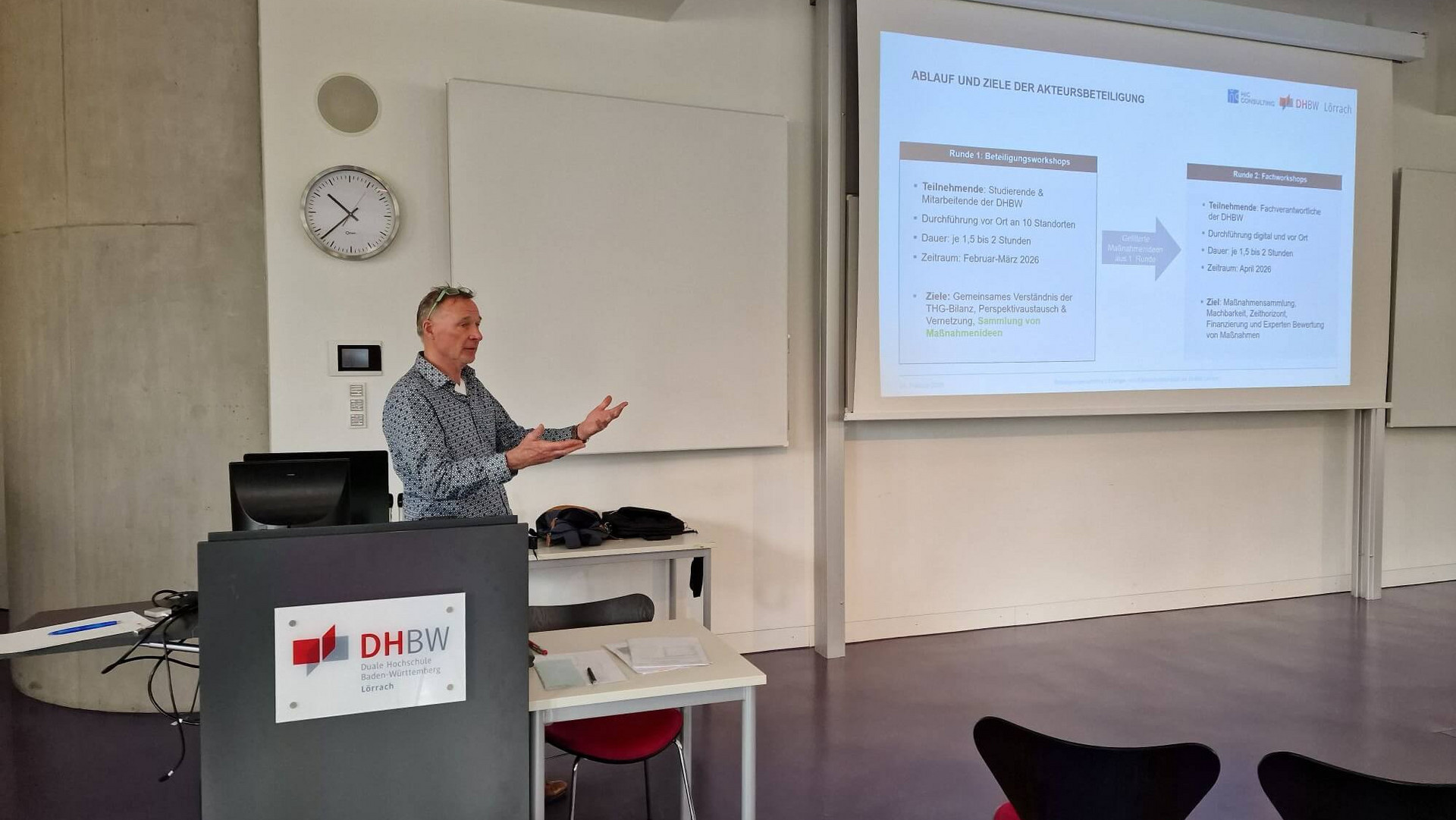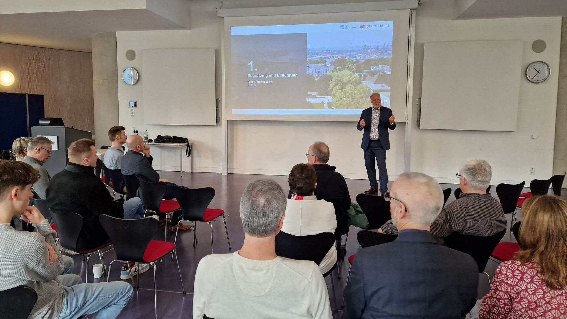 Zum Auftakt begrüßte Rektor Prof. Gerhard Jäger die Teilnehmenden und betonte die Bedeutung der Themen Klimaschutz und Nachhaltigkeit für die Hochschule. Anschließend stellte Frank Leichsenring, Klimaschutzmanager im Cluster Süd und auch für die Studienakademie Lörrach zuständig, Ziele und Ablauf der Veranstaltung vor.