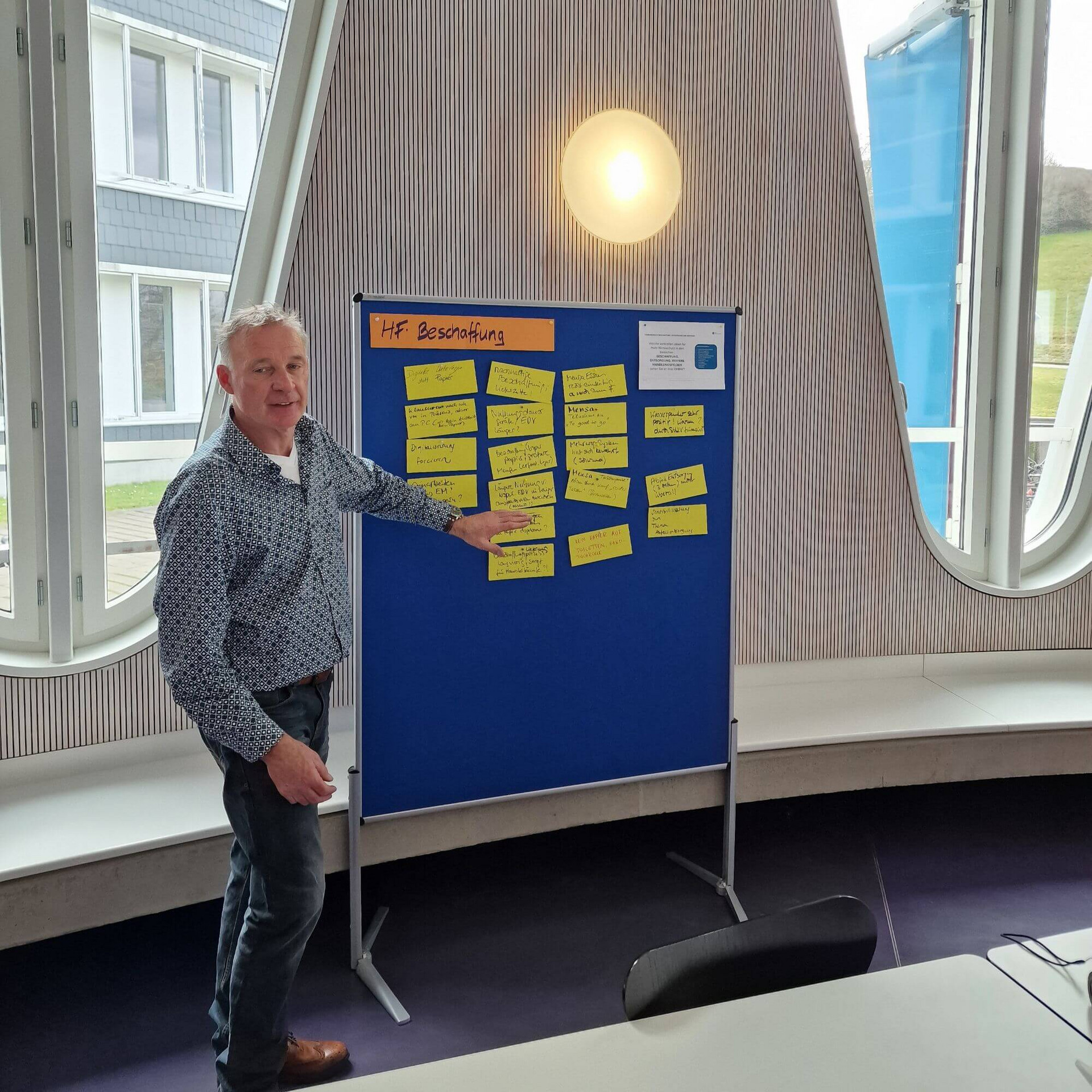 Nach einer kurzen Kaffeepause begann die Ideenphase im Format eines World Cafés. An drei Thementischen zu Mobilität, Gebäude & Energie sowie Beschaffung diskutierten die Teilnehmenden mögliche Maßnahmen und tauschten sich über Erfahrungen und Ansatzpunkte für mehr Klimaschutz aus. Unterstützt wurden sie dabei von Prof. Dr. Harald Nicolai, Leiter des Sustainable Development Centers (SDC), dem Landes-Klimaschutzmanager Tobias Braun sowie Frank Leichsenring.