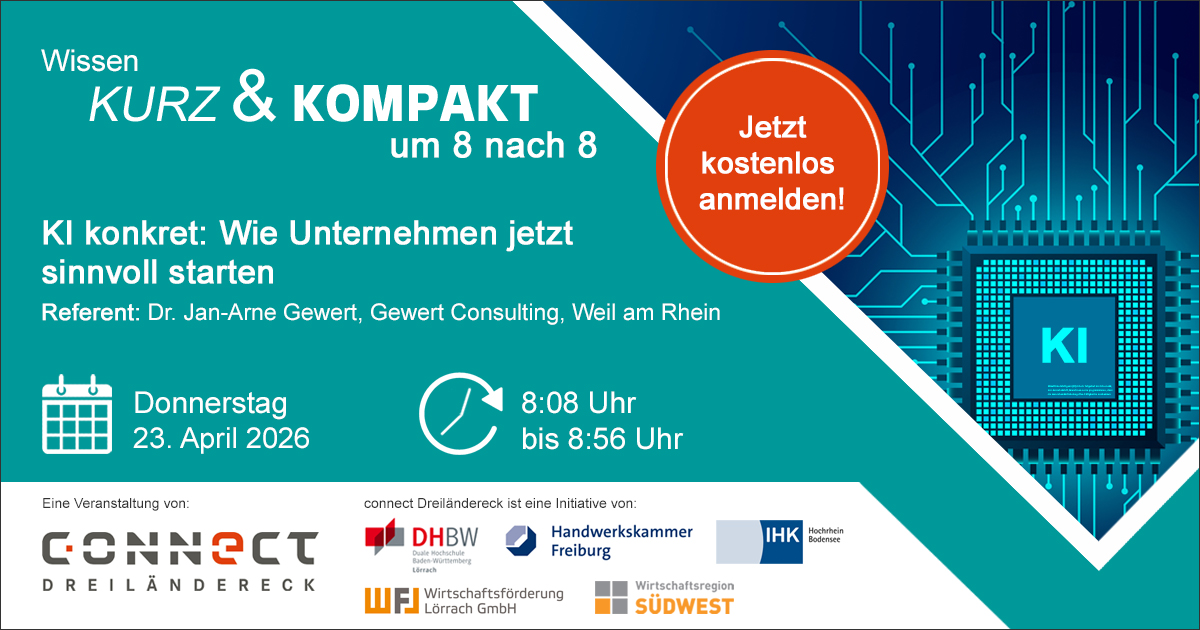 Das IT-Netzwerk connect Dreiländereck ist Veranstalter der monatlichen Webseminar-Reihe "Wissen kurz & kompakt um 8 nach 8". Kurz und kompakt bedeutet: 15 - 20 Minuten Vortrag zum Thema, anschließend Möglichkeit, um Fragen zu stellen, Ende spätestens um 8:56 Uhr. Die Eventreihe findet einmal im Monat statt - immer an einem Donnerstag um 8:08 Uhr. Als Partner von connect Dreiländereck unterstützt die DHBW Lörrach das Format gerne.