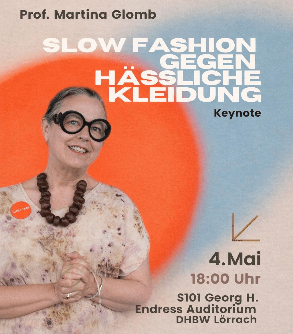 Am 4. Mai hält Frau Prof.in Dr.in Martina Glomb an der DHBW in Lörrach einen Vortrag zum Thema "Slow Fashion gegen hässliche Kleidung". Glomb prägte über zwölf Jahre u.a. als Chefdesignerin in den Studios von Vivienne Westwood in London und Italien internationale Kollektionen – darunter die legendäre „Anglomania“-Linie und „Red Label“. Ab 2002 wechselte sie in die Lehre, unterrichtete u.a. am Royal College of Art sowie an der China Academy of Art in Hangzhou.